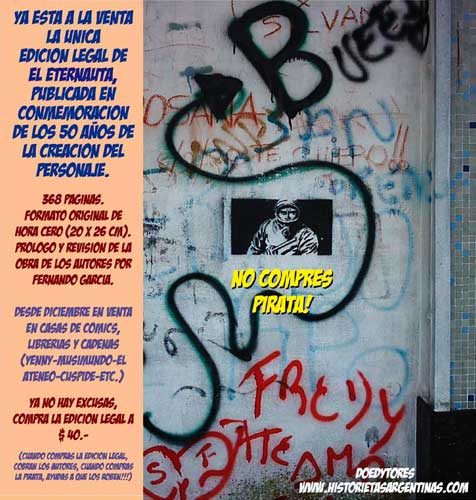 Nueva edición legal de El Eternauta, publicada en conmemoración de los 50 años de la creación del personaje. Formato original de Hora Cero (26 x 20). Prólogo y revisión de la obra de los autores por Fernando García. |
