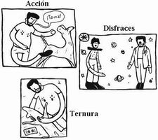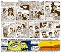 El panorama que quedó después de la crisis era más que sombrío, cuando desaparecieron casi todos los que se aventuraban a publicar algo. Quedaron en pie, contados con los dedos de una mano, los que tenían algún tipo de soporte, es decir, que no dependían de la suerte del último título para sobrevivir. Internet se convirtió en el lugar donde seguir dando vida al género, con el surgimiento de sitios oficiales, personales de autores, de fanas, portales, foros, en una expansión que dio posibilidad a la publicación nuevas de historietas. El último fenómeno es la gran proliferación de blogs de todo tipo. A fines de 2005 aparece el blog de Historietas Reales, que reúne una serie de autores que una vez por semana, con días fijos, suben páginas de historietas, que en principio tenían como premisa reflejar sucesos reales de su vida cotidiana. Con el paso de los meses y la buena repercusión, se sumaron más autores. Ya desde el año pasado se viene observando un lento pero paulatino resurgimiento de las publicaciones de historieta en argentina, con nuevas editoriales, tanto de material nacional como extranjero, acentuado en este 2006. Dentro de las nuevas editoras está Domus, que apareció relanzando en mayo de 2005 la revista de información Comiqueando, ya afianzada en la periodicidad trimestral, y que ahora publica su segundo libro con Historietas Reales, un volumen de 112 páginas, con una selección de lo mejor que se publicó en blog, más material inédito realizado en exclusiva para esta edición. Con este libro, la historieta comienza a recorrer el camino inverso. Primero, ante una coyuntura que imposibilitaba la impresión, Internet como alternativa. Historietas Reales, surgidas en Internet, pensadas y diseñadas para este medio, saltan ahora al papel. Como decíamos al principio, todo un síntoma de que las cosas están mejorando para quienes nos gusta leer historieta. Desde el blog, los autores adelantan el contenido: "Los placeres del fetichismo. ¿Para qué negarlos? Mucho futuro, mucho blog, mucha obra de arte en la era de la reproductibilidad digital, pero acá estamos, disfrutando de la materia como el chancho en el chiquero. El libro recopila parte del material publicado en el blog (que ahora puede ser disfrutado sin recibir radiaciones cancerígenas) e incorpora, con innegable apetito comercial, un importante porcentaje de material inédito, y hasta capítulos enteramente nuevos de "El Asco" y "Autobiógrafo". Todo a un precio muy accesible que no comentamos aquí porque somos artistas y no tocamos el dinero." Participan de Historietas Reales: Federico Reggiani, Fran López, Fabián Zalazar, Diego Agrimbau, Dante Ginevra, Hernán Cañellas, Andrés Biscaisaque, Mr. Exes, Ernán, Clara Lagos, Ángel Mosquito, Caro Chinaski, Rodrigo Terranova, Max Aguirre, Andy Iommi, Z.A.P., Kwaichang Kráneo y el marco tóxico. |