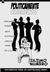 "Ya esta en las comiquerías amigas, el segundo y súper esperado último número de Políticamente Correcto: historietas para un capitalismo sano. Aquí nuevamente Mariano Orpianesi presta su pluma financiera para el guión del Capitán K dibujado (¿Cuando no?) por mis conservadores trazos. Jonathan Weis y Leo rubio (fugados de Punto de fuga) nos cuentan la otra perturbadora historia sobre el mundo del comic, Mauricio Mira (de La Partuza de Osvaldo) trata el tema de la homosexualidad en otro fascinante relato y por supuesto el Noticiometro, un diario facho como dios manda. Se agregan a este numero secciones tales como "anécdotas del Peronismo"; "desde la palmera" y "Las aventuras de Ester, la abuela guerrera" todo por el simple preció de $1,50." Ricardo de Luca |